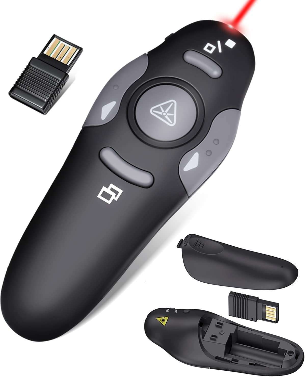 Intuitive four-button layout allows easy navigation through PowerPoint or Keynote slides, plus screen blackout and laser pointer control.